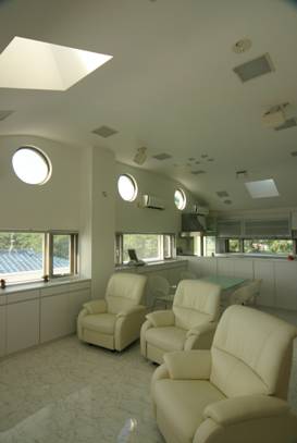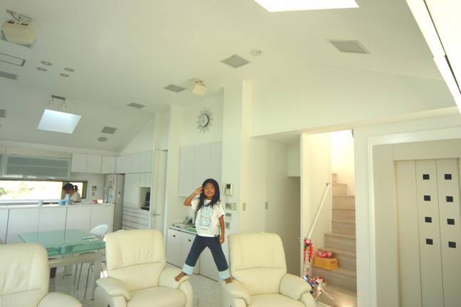 電動天窓、丸高窓、まぶしいほど明るい3階リビング玄関からエレベーターで!